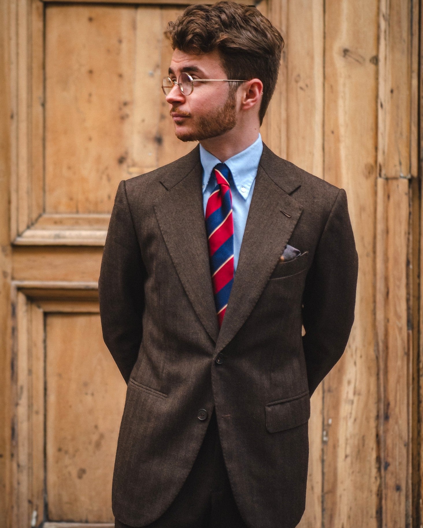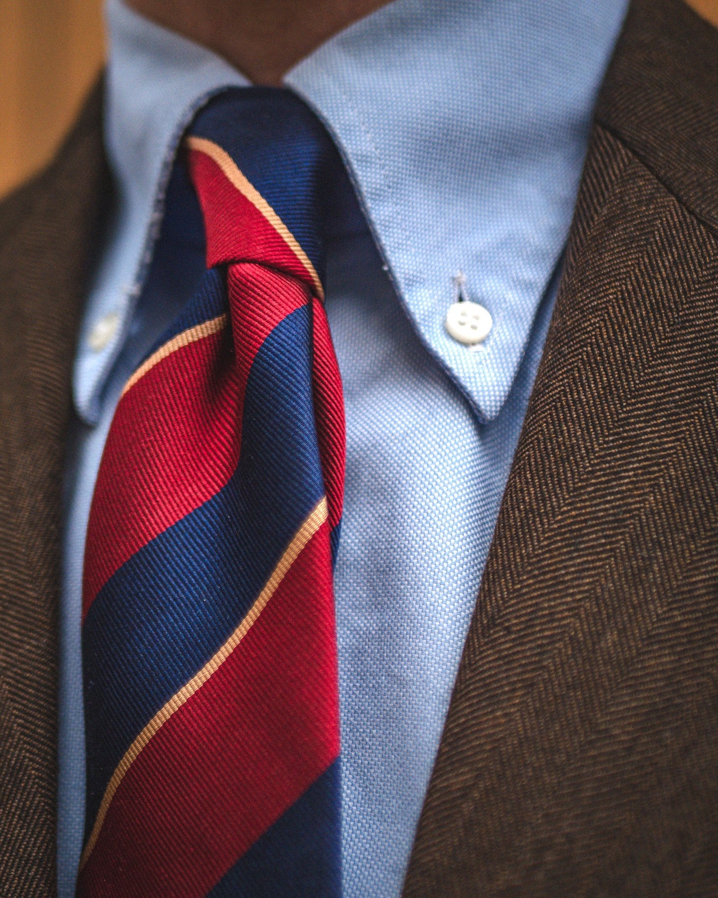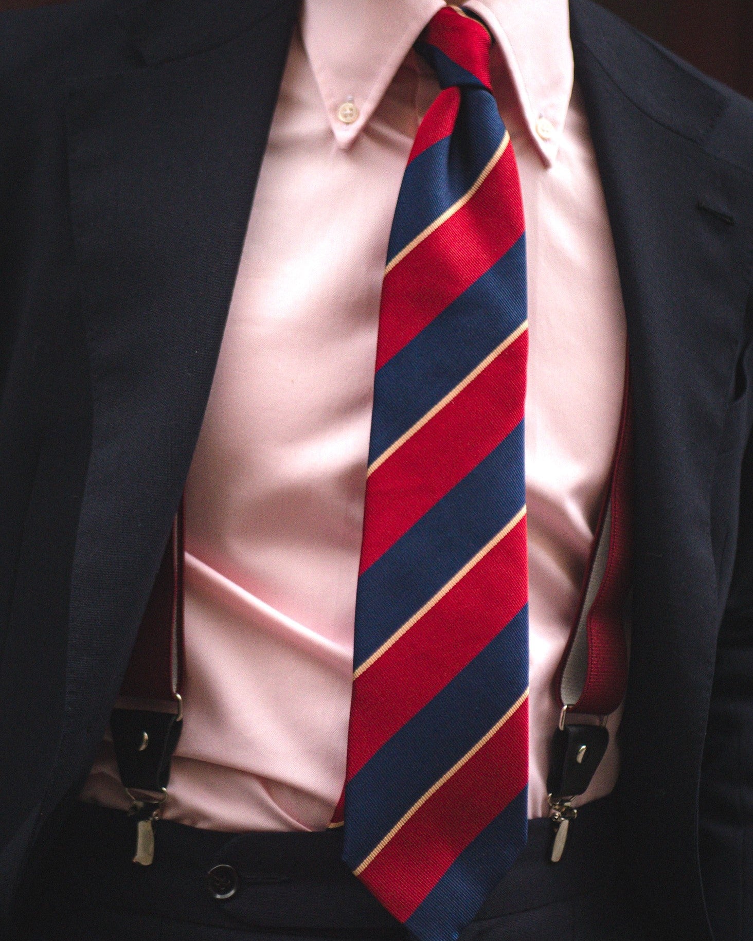 Une cravate club aux larges rayures marines et bordeaux avec un fin liseré doré.