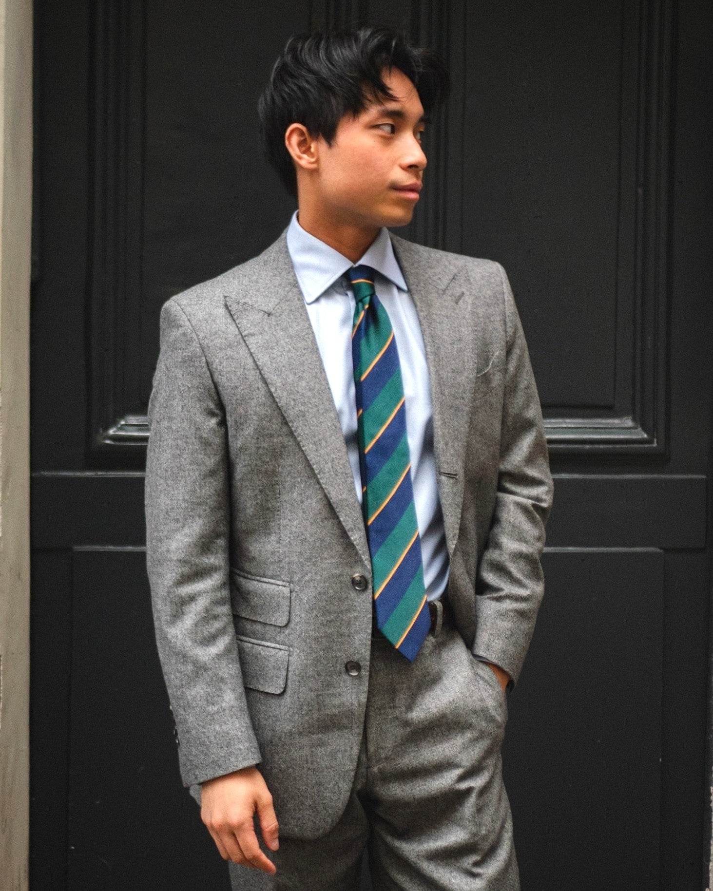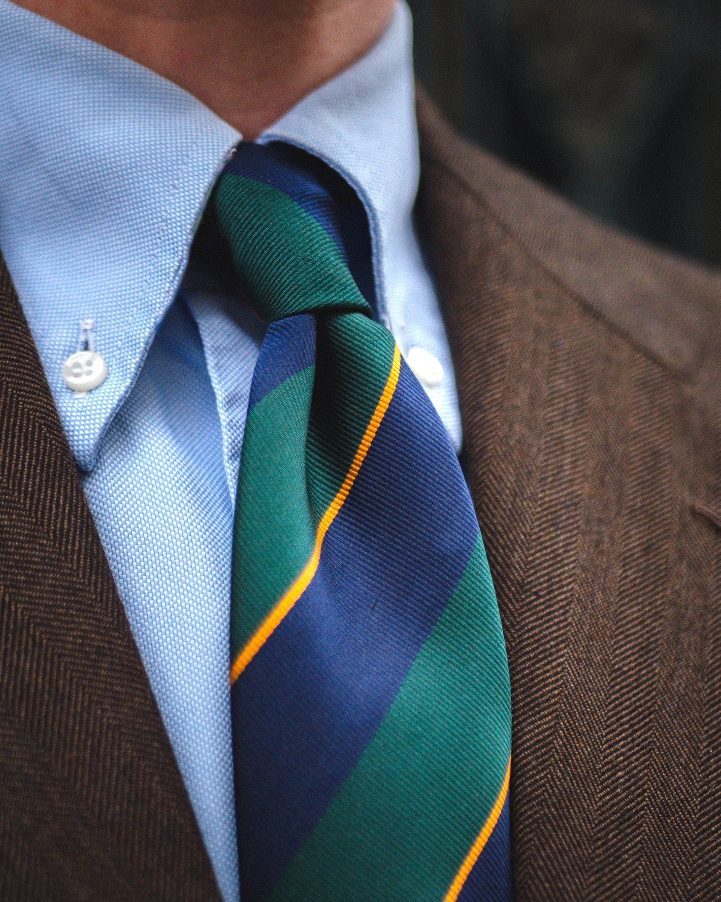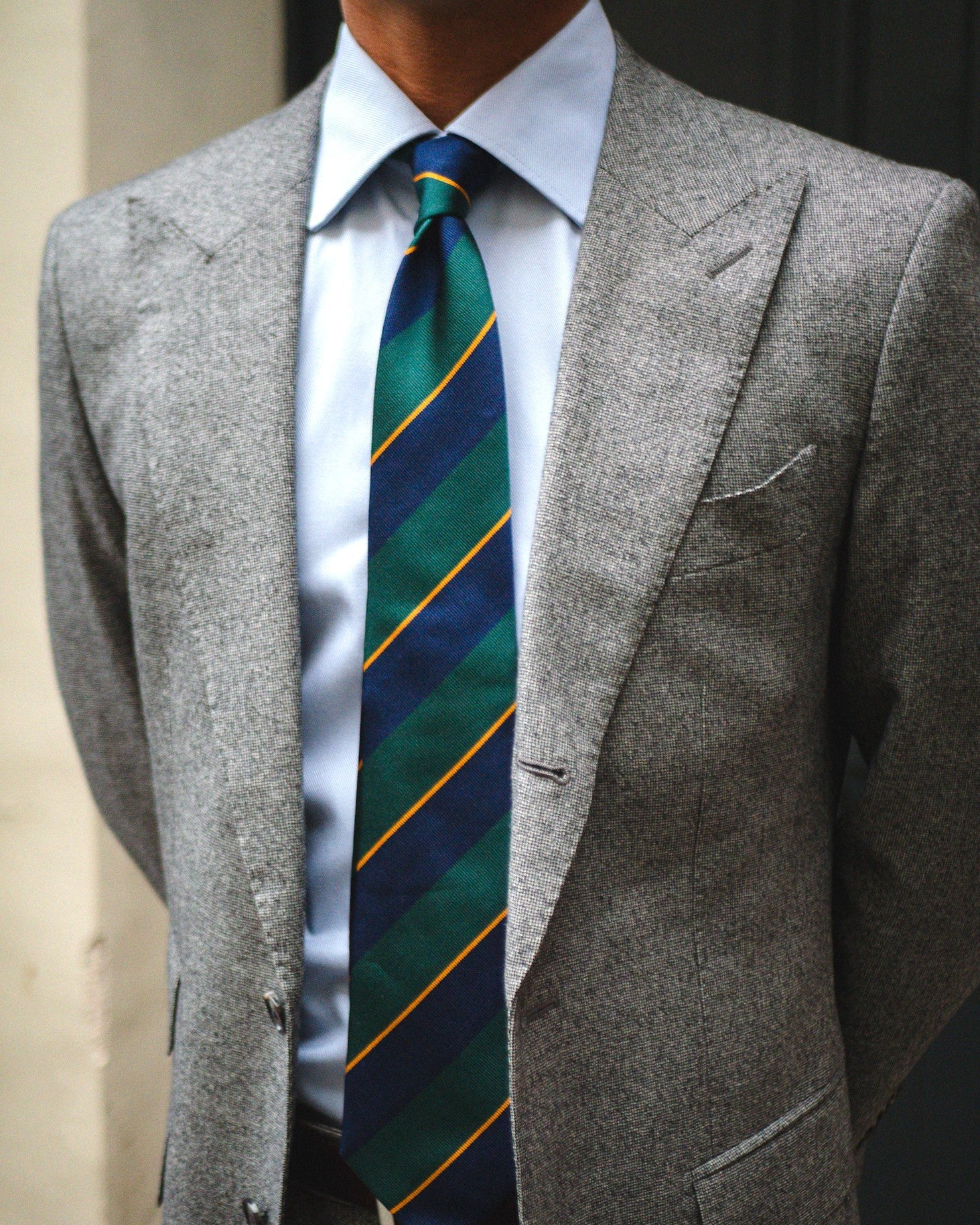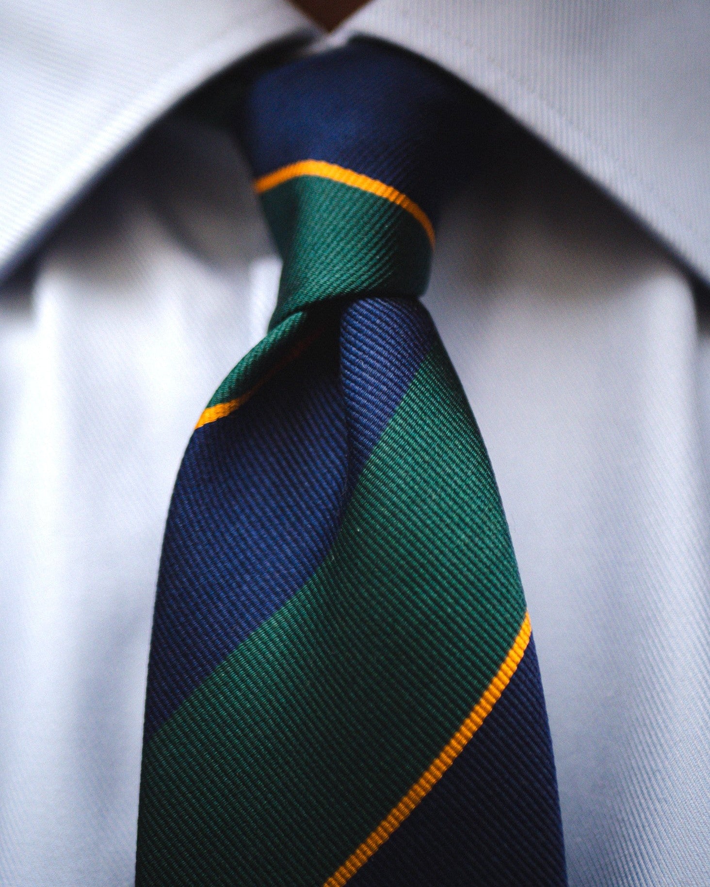Une cravate club aux larges rayures marines et vertes avec un fin liseré doré.